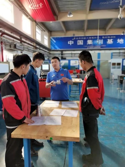 数控机床前,一身蓝色工装的王展超被一群学生围在中间,这个连续三届世界技能大赛数控车项目的国家队教练,现在正带着他的学生们簇拥在机床前,聚精会神地绘着图纸、做着模具……